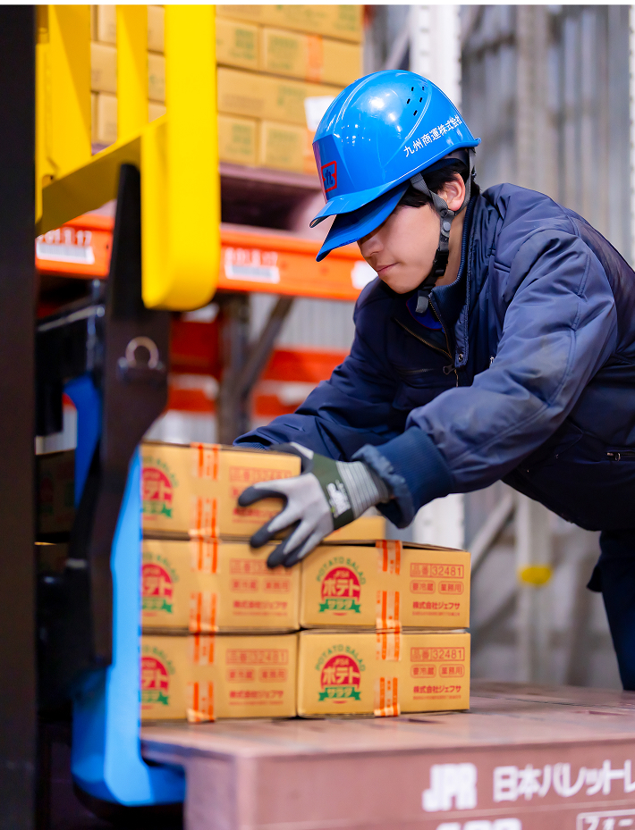九州の海の玄関口、箱崎ふ頭。当社はここに8棟の営業倉庫を保有し、輸出・入通関業務の仲介、コンテナのドレッジ、危険物を含む国内貨物保管、荷役、配送など、総合的な物流をサポートしております。 また、地場配送はもちろん、九州一円そして京阪神を網羅し全国配送も手掛けています。食品から工業品、各種危険品にいたるまで、荷姿や重量などに合わせたフレキシブルな輸送体制でサポートします。